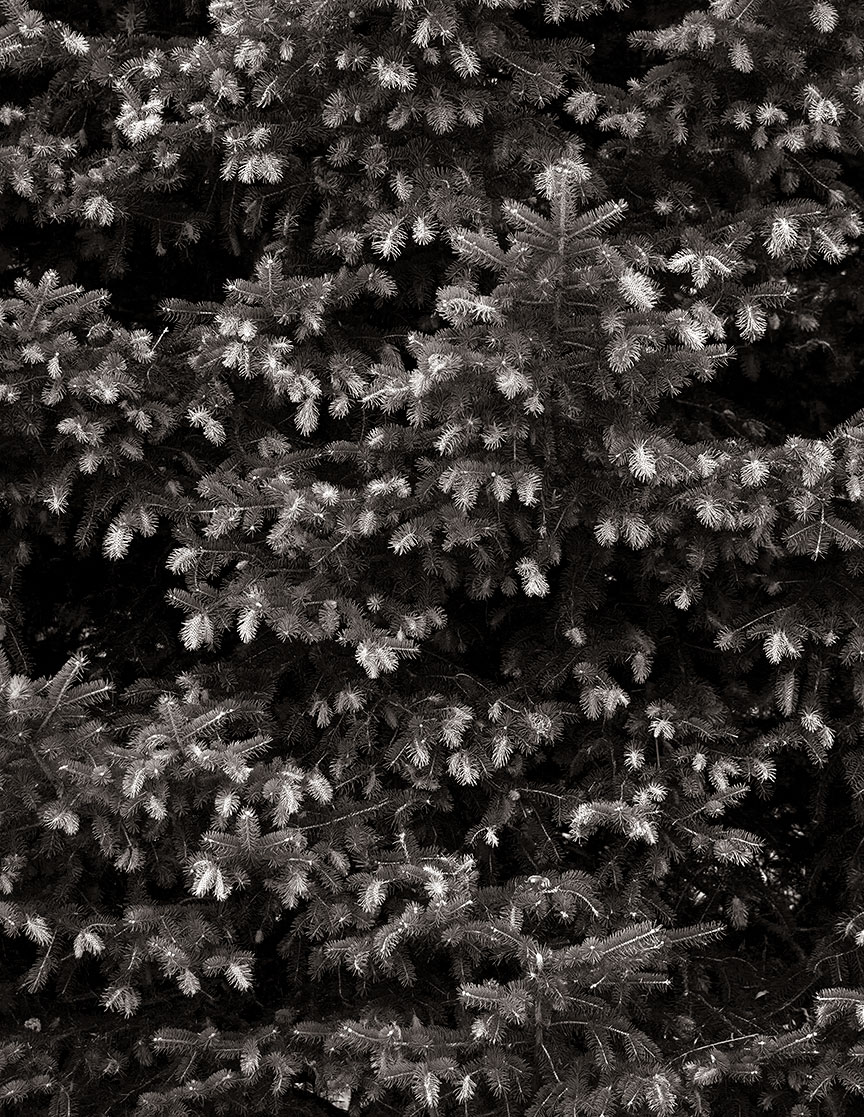 New growth on a pine tree in Arroyo Seco, NM. The new growth on the branches are a lighter green than the rest of the tree. Edited as a black and white image, this is what I came up with.