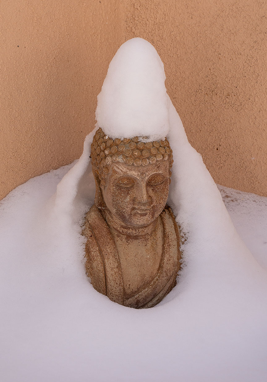 Greetings from San Cristobal, NM. This week’s photos include Taos Mountain (Pueblo Peak), before the foot of snow, Buddha in the garden after the snow, a northern Flicker in the old cottonwood, and a crescent moon.