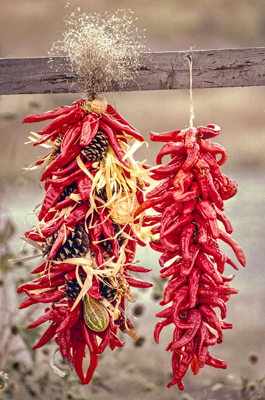 A chile ristra is a string (or braid) of whole chile pods—traditionally New Mexico red chiles—tied together and hung up to dry. You’ll see them draped over doorways, portals, porch beams, or kitchen walls all across New Mexico. They’re food, folk art, and regional identity all rolled into one.