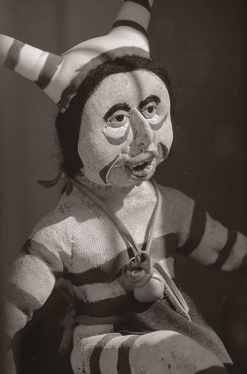 Koshare doll/artwork/sculpture in the window of a Santa Fe Art Gallery, 1984.