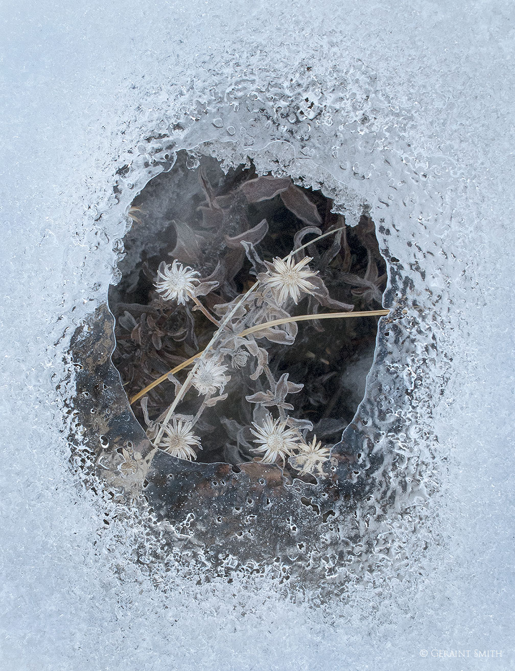 This photo was taken on a hillside in Elizabethtown, located in the Moreno Valley, New Mexico. The hillside was covered in ice, which was beginning to thaw around the small, ice-bound plants.