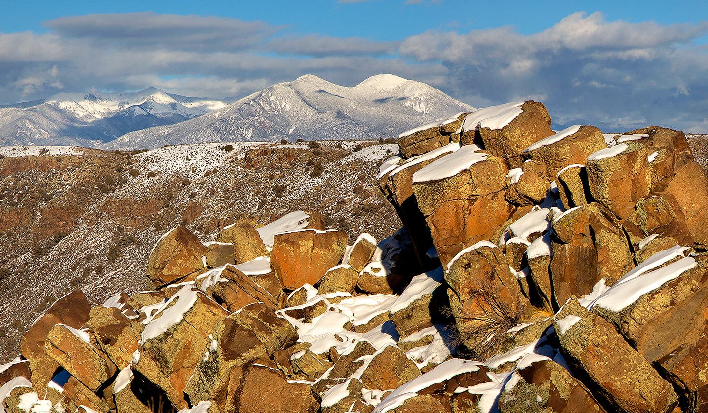 “In Thanksgiving week 1984, I made my first of many trips to New Mexico. On this occasion, five of us friends set out on a foggy morning from Santa Fe and made our way north on the high road to Taos. The sites and sounds on the streets of Santa Fe soon opened up to the immense vistas of mesas, and beyond to the Taos Volcanic Plateau.